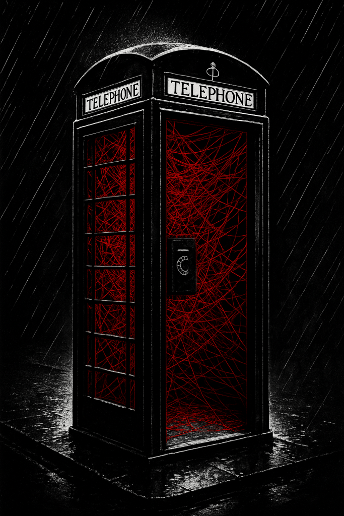 IMAGINE an old telephone booth — the nostalgic British kind. As a functional relic, the paint is chipped, the windows fogged, the receiver long gone. No one calls from here anymore. Inside hangs Shiota Chiharu’s Rain of Memories: red threads tangled from wall to wall in the meter-wide frame, turning the booth into a soft trap of memory. Keys dangle gently as the door opens, like forgotten voices waiting to be noticed. The strings, like nerves once meant for connection, now carry silence — and yet the booth remains, no longer in use, but standing still with quiet dignity, holding this deep crimson of nervous system and blood vessels of memory.
